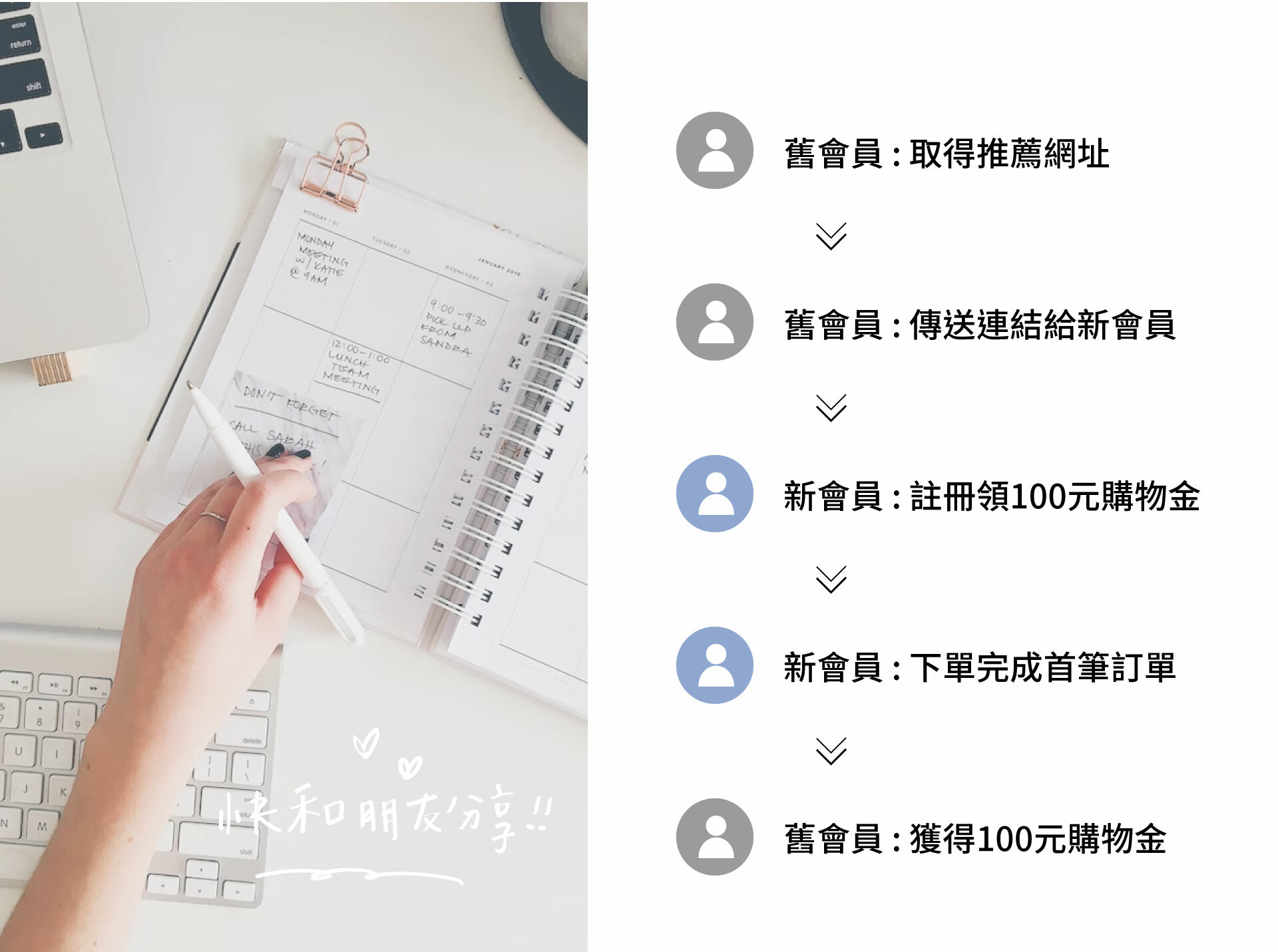 現在我們推出「會員獎勵計畫」,在分享的同時,和好友有機會各獲得 100元購物金!