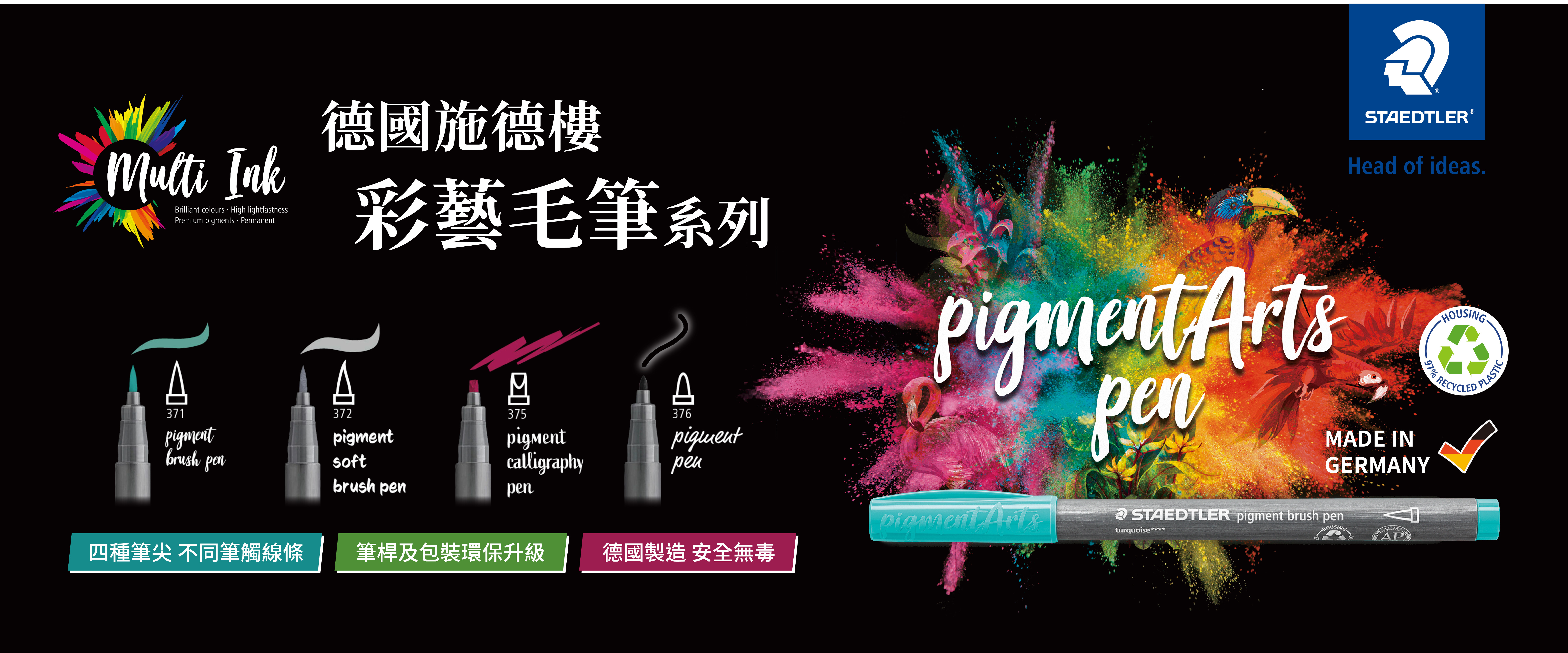 「最近的新玩具 #施德樓 MS371 彩藝毛筆,德國製,雖然說是毛筆,但只是軟筆頭,可以畫出粗細不同的線條,先試畫了三個圖,特色是: