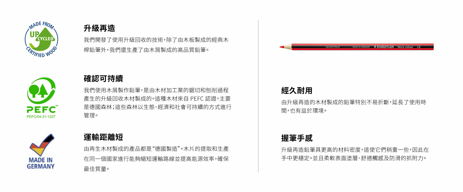 為我們自己、我們的子孫後代保護自然是我們的職責。出於這個原因,我們開發了一種更有效地使用木材(我們鉛筆最重要的材料)的工藝。我們使用木材加工業產生的木屑製造「升級再造」的木鉛筆。通過這種方式,我們可以有效地利用資源,保護環境,甚至為最小的木材殘渣賦予新的用途。