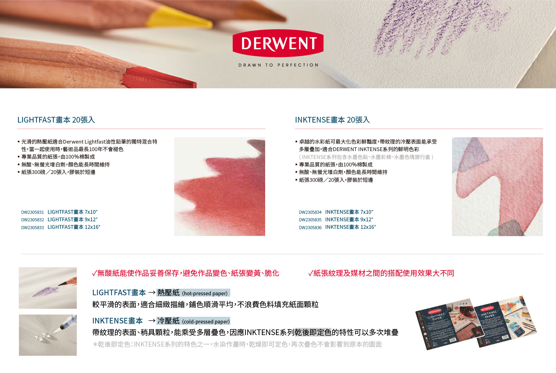˙光滑的熱壓紙適合DerwentLightfast油性鉛筆的獨特混合特性,當一起使用時,藝術品最長100年不會褪色。
